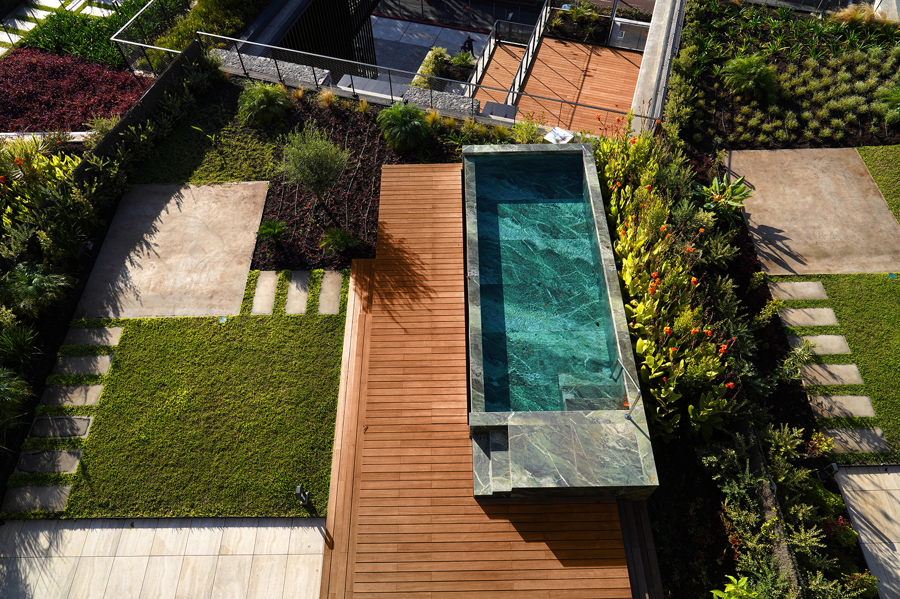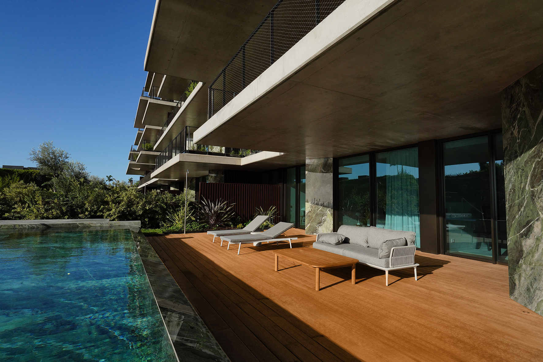 The decking was applied in strategic areas of the development, such as the large balconies and the outdoor areas next to the swimming pools, contributing to a harmonious experience for the residents. With a colour that resembles the interior flooring, it provides a fluid visual continuity, expanding the perception of space and reinforcing the architectural concept of integration between internal and external environments.